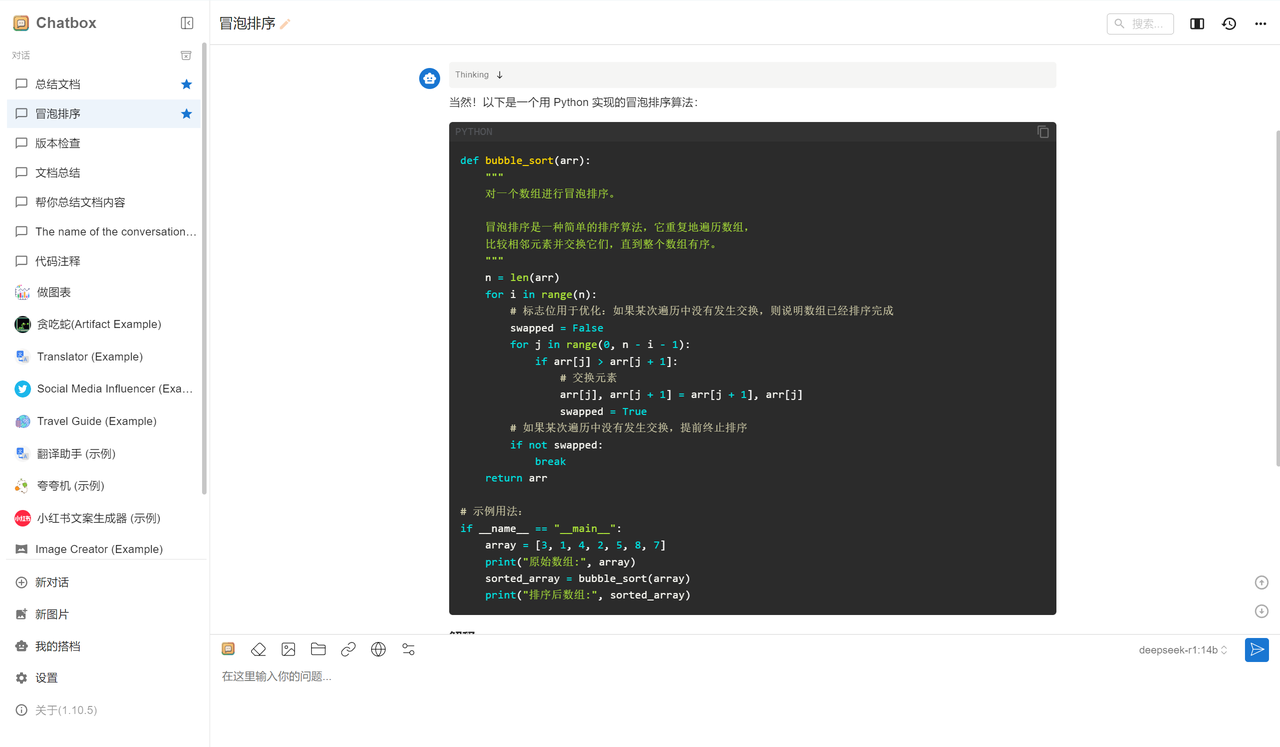 - 返回主界面,输入问题(如“用 Python 写快速排序”),Chatbox 会通过本地模型生成回答。